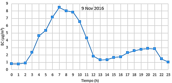 Para el día de estudio (9 de noviembre de 2016), se obtuvo un comportamiento del perfil horario de las concentraciones de BC con un pico máximo de concentración para el día de verano de 8,47 µg/m3 a las 7 horas.