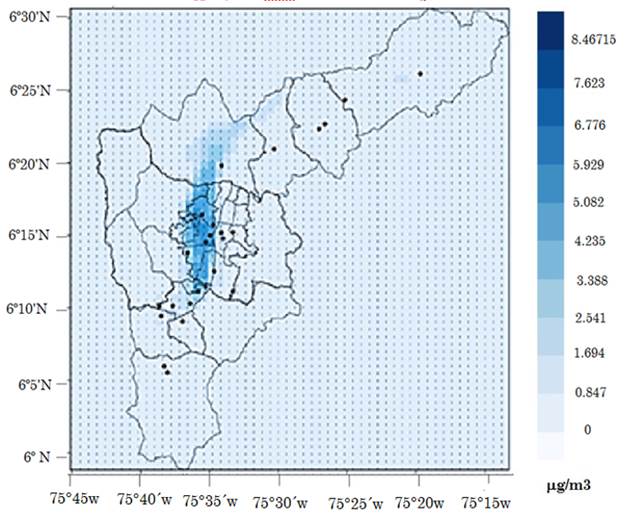 El día mencionado fue evaluado en el punto donde se encuentra la estación automática de monitoreo de la calidad del aire ubicada dentro de la Universidad Pontificia Bolivariana (75°35’27,08’’O, 6°14'36,85"N), debido a que es una zona poblacional expuesta en donde es posible de evaluar el desempeño del modelo pues se cuenta con una campaña de medición del contaminante estudiado.
