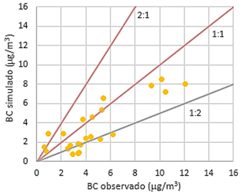 En primera instancia, en la Figura 5, se presenta un análisis cualitativo de la precisión del modelo CAMx al predecir las concentraciones horarias de BC para el 9 de noviembre de 2016. La Figura 5 indica que el modelo se encuentra sobre-estimando aproximadamente el 25 % de las concentraciones simuladas, mientras que el 67 % de éstas se encontraron en la zona 1:1, es decir, los valores se ajustaron muy bien a la realidad. El 8 % restante, muestra que el modelo subestimó las concentraciones, entregando valores menores a los medidos.