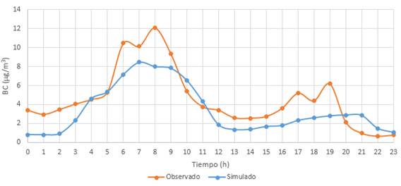 A continuación, se presenta la comparación de los perfiles horarios, simulado y observado, de las concentraciones de BC para el día de estudio, el cual tiene condiciones meteorológicas favorables para la dispersión de contaminantes y se encuentra dentro de la campaña de medición realizada por el grupo GHYGAM.