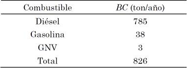 En la Tabla 2 se presentan las emisiones anuales de BC discriminadas por categoría vehicular. Se observa que la categoría camiones seguido de las volquetas son los mayores emisores aportando el 43 % y 37 %, respectivamente, del total de las emisiones asociadas a fuentes móviles.