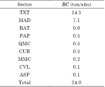El sector textil es el que más aporta en emisión de este contaminante seguido de la industria maderera, con un 59 % y 30 %, respectivamente, del total de las emisiones de BC asociadas a fuentes fijas.