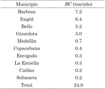 En la Tabla 6 se muestran las emisiones anuales por municipio, en donde se observa que el municipio de Barbosa realiza los mayores aportes de BC seguido del municipio de Itagüí con un 32 % y 27 %, respectivamente, del total de las emisiones en el Valle de Aburrá. Los demás municipios del Valle de Aburrá aportan muy poco a la emisión de este contaminante.