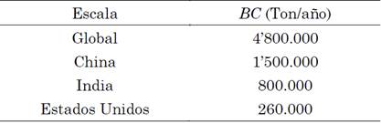 En la Tabla 7 se muestran las estimaciones de emisión anuales de BC por diferentes inventarios globales y regionales para el año 2000, los cuales muestran que la variación de estas emisiones es considerablemente amplia, donde los rangos a nivel global varían de 4’500.000 a 12’600.000 Ton/año, mientras que los rangos a nivel regional varían de 260.000 a 1’800.000 Ton/año [15].