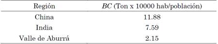 En la Tabla 8 se muestra la comparación de emisiones de BC por cada 10000 habitantes para el Valle de Aburrá y los países de China e India, en donde se muestra que China tiene la mayor emisión de BC, la cual es aproximadamente cinco veces la emisión del Valle de Aburrá por cada 10000 habitantes.