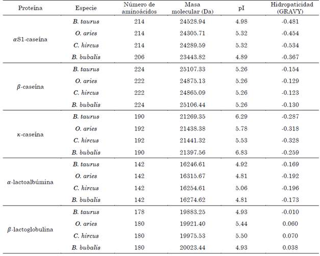 Como se observa en la Tabla 2, el registro de variación en el número de aminoácidos para una misma proteína entre las diferentes especies es mínimo. La mayor disimilitud se presenta en la αS1-caseína de B. bubalis respecto a las isoformas de las otras especies; una diferencia de ocho residuos en la αS1-caseína de B. bubalis puede tener una repercusión considerable al comparar el número de PBA liberados contra los PBA de la misma proteína obtenidos de las otras especies. Las demás isoformas varían entre especie por un numero de residuos no superior a dos.