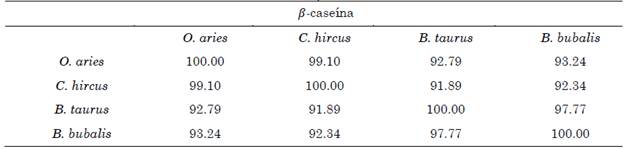Las Tablas 3 a 7 presentan el grado de homología entre las isoformas correspondientes a cada organismo. La representación en forma de matriz permite obtener la relación entre las cuatro especies de forma simultánea. Para las cinco proteínas estudiadas se cumple que: el bovino (B. taurus) y el búfalo (B. bubalis) presentan isoformas con un grado de homología mayor a 90 %, y la cabra (C. hircus) y la oveja (O. aries) presentan isoformas con un grado de homología mayor a 95 %. Pese a que las cuatro especies de rumiantes pertenecen a la familia Bovinidae, B. taurus y B. bubalis son especies pertenecientes a la subfamilia Bovinae mientras que C. hircus y O. aries pertenecen a la subfamilia Antilopinae [20]. Diferentes estudios se han centrado en dilucidar la relación filogenética entre las especies estudiadas por medio de análisis moleculares. Como concluyen [21], a partir de la evaluación de la homología de la secuencia de nucleótidos que codifican para la κ-caseína se determinó: un 92.7 % de homología entre O. aries y B. taurus y un 96.7 % de similitud entre B. bubalis y B. taurus. Adicionalmente, se encontró, con excepción de leves polimorfismos, una secuencia idéntica entre O. aries y C. hircus.