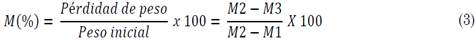 Dónde: M1 =peso (g) del contenedor y tapa; M2 = peso (g) del contenedor, la tapa y el contenido antes del secado; M3 = peso (g) del contenedor, la tapa y el contenido después del secado