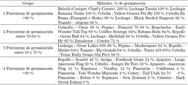 Los resultados de la evaluación de 36 híbridos de hortalizas comercializados en la región Centooccidental de Venezuela se muestran en la Figura 1. Allí se puede observar que el 57,14 % presentaron una germinación optima (>90 %); 28,67 %, germinación moderada (50-90 %); y 14,29 % fue deficiente (<50 %). Particular interés debe prestarse a los híbridos de espinacas Viroflay y New Zealand, ajoporros American Flag y Large American Flag y acelga Fordhook Giant, las cuales presentaron una germinación debido a la perdida de la viabilidad de las semillas por el tiempo de almacenamiento y proliferación de patógenos por posibles condiciones inadecuadas de almacenamiento [23].