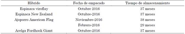 Se utilizaron híbridos de acelga (Fordhook Giant), ajoporros (Large American Flag y American Flag) y espinacas (New Zealand y Viroflay), los cuales fueron empacados en octubre de 2016, febrero de 2017, noviembre de 2016 y octubre de 2016, respectivamente.