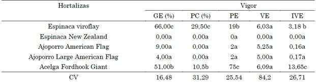 Los resultados obtenidos muestran que el porcentaje de germinación fue estadísticamente más alto (P<0,05) en la espinaca Viroflay con 66 % de germinación, seguido de la acelga Foordhood Giant con 51 %, mientras que los valores más bajos de germinación se observaron en los ajoporros American Flag y American Flag Large y en la espinaca New Zealand con valores de 9,4 y 0 %, respectivamente. Con relación a la velocidad de germinación, los híbridos que germinaron más rápido fueron la acelga Foordhood Giant y la espinaca Viroflay en 6,09 y 6,03 días, seguido de los ajoporros American Flag y American Flag Large, que germinaron a los 5,25 y 5 días, mientras que la espinaca New Zealand no germinó. El hibrido más eficiente durante la emergencia fue la acelga Foordhood con un IVE de 13,65, seguido de la espinaca Virofly, con IVE de 3,18. Por su parte, los valores más altos de IVE corresponden a ajoporros American Flag y American Flag Large, con 0,16 y 0,17.