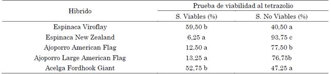 La disminución del porcentaje de germinación estuvo asociada a la viabilidad de las semillas. En la Tabla 4 se observa que las semillas de ajoporros de American Flag, American Flag Large y espinaca New Zealand presentaron el menor porcentaje de germinación, obteniendo el menor número de semillas viables, mientras que las semillas de espinaca Viroflay y acelga Foordhood Giant, presentaron el mayor porcentaje de germinación y, a su vez, el mayor número de semillas viables al realizar la prueba de tetrazolio.