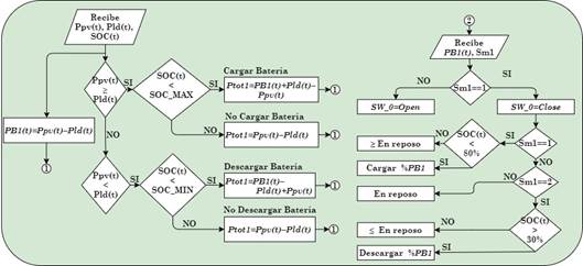 Para el diagrama del agente fotovoltaico mostrado en la Figura 6, el algoritmo recibe información de la potencia generada en la DER, la potencia de consumo de la carga y el SOC de la batería. El primer paso realizado por el algoritmo es adquirir la diferencia de potencia que hay en el panel solar y la potencia consumida por la carga. Una vez obtenida la diferencia de potencia, verifica el SOC de la batería, el cual debe estar entre los valores de estado de carga (SOC_MIN) y (SOC_MAX), para los valores mínimo y máximo, teniendo en cuenta los trabajados en [32]. Dependiendo del estado de carga (SOC), el algoritmo calcula la potencia total que se está generando en ese momento en la MG-i. Este valor calculado es entregado al agente de gestión de energía (GE), y dependiendo del estado de la batería se le puede indicar al agente (GE) que se necesita cargar o descargar, o mantenerse con la reserva. Si el SOC de la batería es mayor al valor SOC_MAX, el agente fotovoltaico no carga la batería con el fin de evitar un exceso de carga, caso contrario si es menor indica que requiere energía. Si el SOC es mayor al valor SOC_MIN, el algoritmo permite la descarga de la batería hasta el valor mínimo. Una vez alcanzado este valor no se permite continuar la descarga, esto con el fin de evitar descargas profundas en la batería. Después de enviar información al agente de gestión de energía, la información de regreso al agente fotovoltaico es abrir o cerrar su interruptor principal para entregar potencia a la microrred y permitir la carga o descarga de la batería.