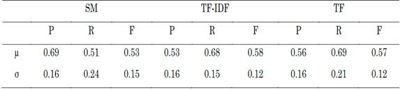 Tabla 3 Promedio (µ) y desviación estándar (σ) para las métricas ROUGE-1 para los resúmenes automáticos de noticias empleando los algoritmos basados en similitud (SM), TF-IDF y TF.