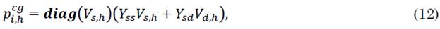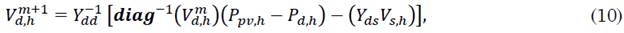 donde m es el contador iterativo; V d es el vector que contiene todas las variables de tensión para todos los nodos de demanda en cada periodo de tiempo h; P pv,h es el vector que contiene toda la generación de potencia activa en las fuentes fotovoltaicas en cada periodo de tiempo h; P d,h es el vector de demanda de potencia activa en los nodos de demanda en cada periodo de tiempo h; V s ,h es la tensión en el nodo de la subestación en cada periodo de tiempo h; Y dd es una matriz cuadrada que contiene todas las admitancias entre los nodos de demanda; Y ds es una matriz rectangular que contiene las admitancias entre los nodos de demanda y el nodo de la subestación. Cabe recordar que para el modelo de CC que se está empleando, estas matrices de admitancias no contienen componente imaginaria, solo componente real.