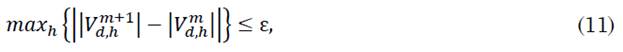 La principal característica de la fórmula recursiva del flujo de potencia (10) es que su convergencia a la solución del flujo de potencia puede garantizarse mediante la aplicación del teorema del punto fijo de Banach [32]. Para determinar si la fórmula del flujo de potencia (10) converge, se utiliza (11), que corresponde a la diferencia entre las magnitudes de tensión entre dos iteraciones consecutivas, i.e.,