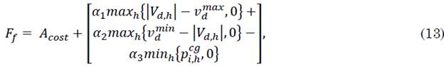 Nótese que con la solución del p i,h cg en (12) es posible determinar la primera componente de la función objetivo, es decir, f 1 ; mientras que el vector de solución proporcionado por la etapa maestra asigna los tamaños de las fuentes PV, entonces, se calcula la segunda componente de la función objetivo, es decir, f 2 . Sin embargo, en los optimizadores metaheurísticos, la exploración y explotación del espacio de soluciones se realiza mediante la aplicación de una función de adaptación denominada función fitness [34]. La función fitness es una adaptación de la función objetivo común en metaheurísticas, para cada individuo a partir del conjunto de soluciones candidatas resultantes en la etapa maestra [35]. Además, contiene dos factores de penalización relativos a la restricción de regulación de tensión, y un factor de penalización adicional relativo a la definición positiva de la generación de potencia activa en el nodo de la subestación. La función fitness propuesta se define en (13), donde a 1 , a 2 y a 3 son factores de penalización positivos que se activan en el caso de que el límite de regulación de tensión o la generación de potencia activa en el nodo de la subestación violen sus límites.