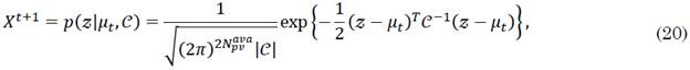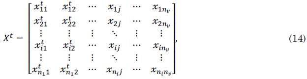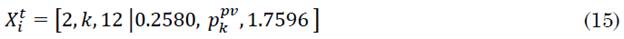 La principal característica del método de solución propuesto es que trabaja con una codificación entera-continua, donde la parte entera está asociada a los nodos donde se ubicarán las fuentes fotovoltaicas, y la parte continua define sus tamaños óptimos. Observe que, en el problema estudiado, n i es igual a 2N pv ava , cada fila i de la población inicial, es decir, X i t que tiene la forma presentada en (15):