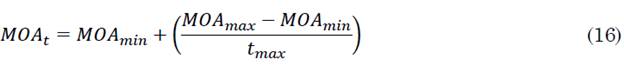 donde las primeras posiciones de N pv ava corresponden a la parte entera de la codificación, y las posiciones desde N pv ava +1 hasta N pv ava están asociadas a la parte continua del problema de optimización. Para explorar el espacio de soluciones, el AOA emplea la función de aceleración (16), denominada MOA, que depende de sus valores máximos y mínimos (MOA min y MOA max ) así como del contador de iteraciones actual t y del número máximo de número de iteraciones t max .