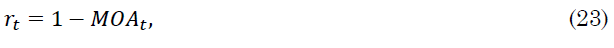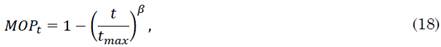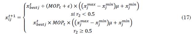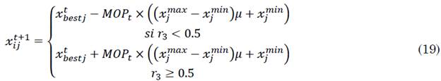 Donde x ij t+1 denota la j th posición de la i th solución en la siguiente iteración, y x bestj t es la j th posición de la solución mejor obtenida hasta el momento; x j max y x j min son el valor del límite superior e inferior de la j th posición, respectivamente y MOP t es un factor variable que depende del número de iteraciones con la estructura de (18):