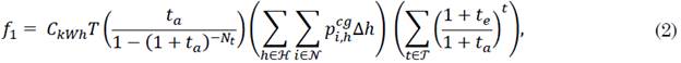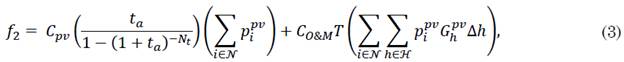Cada componente de la función objetivo se presenta de (1) a (3), donde, A cost representa los costos operativos anuales equivalentes de la red de distribución; f 1 representa la componente de la función objetivo asociada a los costos anuales esperados de compra de energía en terminales de la subestación; f 2 es la componente de la función objetivo asociada a los costos totales de inversión y mantenimiento de las fuentes fotovoltaicas instaladas; C kwh es el valor del costo medio de la energía en los terminales de la subestación; T corresponde al número de días de un año ordinario (i.e., 365 días); t a es la tasa de rendimiento interno que la empresa de servicios públicos espera para sus inversiones a lo largo de la duración del proyecto; N t corresponde al número de años del horizonte de planificación; p ih cg corresponde a la generación de potencia activa en el nodo de la subestación conectado en el nodo i durante el periodo de tiempo h; ∆h es la duración del periodo de tiempo en el que las variables eléctricas se asumen como constantes; t e es el porcentaje previsto del aumento del costo de la compra de energía durante el horizonte de planificación; C pv es el costo medio de la instalación de un kW de potencia fotovoltaica; p i pv representa el tamaño de la fuente fotovoltaica conectada en el nodo i; C 0&m representa los costos de operación y mantenimiento por unidad de energía generada en una fuente PV; p h pv representa la curva de producción de energía prevista de los generadores fotovoltaicos en la zona de influencia de la red de distribución. Obsérvese que, H, N y T son los conjuntos que contienen todos los periodos de tiempo en un escenario operativo diario, los nodos de la red, y el número total de años del horizonte de planificación, respectivamente.