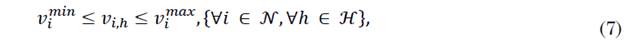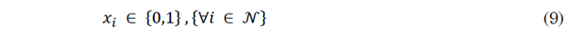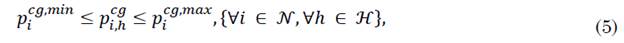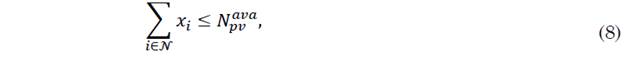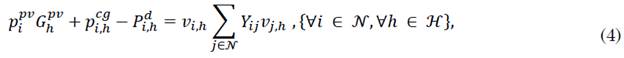 La lista completa de restricciones para el problema estudiado se enumera de (4) a (9), donde, p i,h d representa la demanda de potencia activa en el nodo i durante el periodo de tiempo h; Y ih, es la magnitud de la admitancia que conecta los nodos i y j (es importante tener en cuenta que para redes de CC este es un parámetro definido en los números reales ya que, estos sólo corresponden a los elementos resistivos presentes en la red); v i,h y v j,h son la magnitud de las tensiones en los nodos i y j, respectivamente; p i cg,min y p i cg,max representan los límites de generación de potencia activa en la subestación conectada al nodo i; x i es la variable binaria relativa a la ubicación de las fuentes PV en la red de distribución en el nodo i, indicando que x i =1 si la fuente PV está instalada o x i = 0 si no se encuentra instalada; p i pv,min y p i pv,axn son las dimensiones mínima y máxima permitidas para las unidades de generación PV conectada al nodo i; v i min y v i max son los límites de tensión mínima y máxima en cada nodo. Por último, v pv ava es el parámetro constante que define el número máximo de fuentes PV que se instalarán en la red de distribución.
