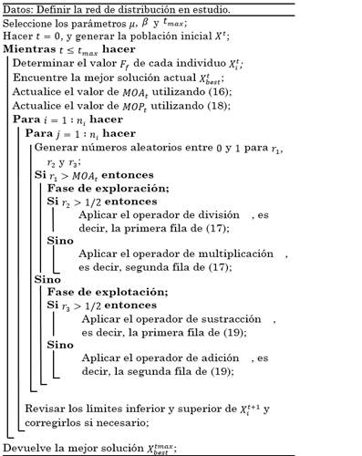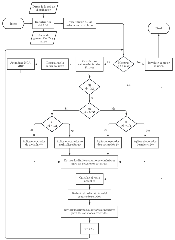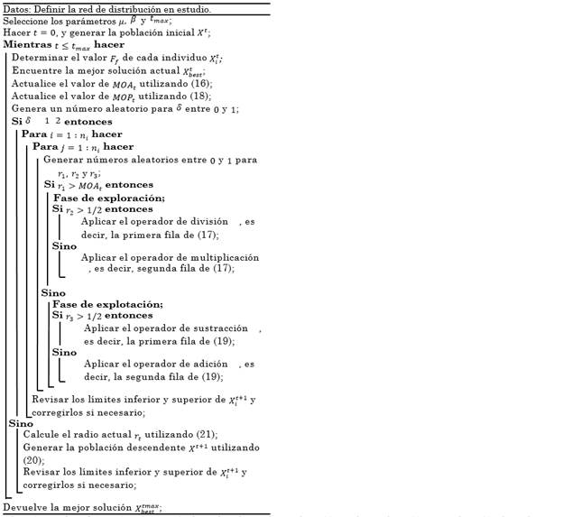 Cabe destacar que cada nuevo individuo generado en las fases de exploración y explotación debe ser revisado para asegurar que cada nueva posición x j t+1 se encuentre entre sus límites máximo y mínimo, es decir, x j max y x j min para asegurar la viabilidad del espacio de soluciones. Además, las primeras posiciones N pv ava del nuevo vector de solución x i t+1 , se redondean cercanos a valores de enteros, ya que corresponden a los nodos donde se instalarán las fuentes fotovoltaicas, es decir, deben ser siempre valores enteros. La aplicación del AOA descrito se puede realizar siguiendo el Algoritmo 1.
