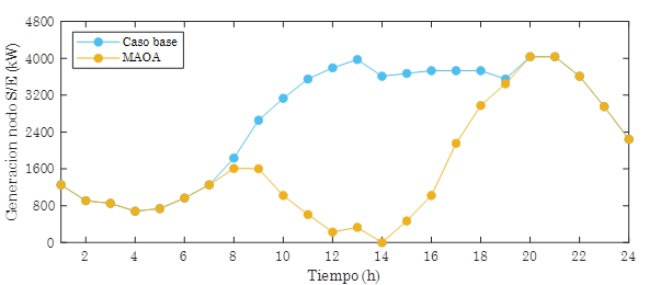 Se observa que, la generación de potencia activa en el nodo de la subestación para el caso de referencia sigue el comportamiento de la curva de demanda medida en los terminales de la subestación, y cuando se instalan los generadores fotovoltaicos, la potencia activa inyectada en este nodo se reduce considerablemente a medida que aumenta la generación fotovoltaica.