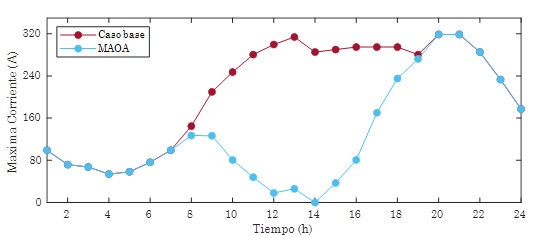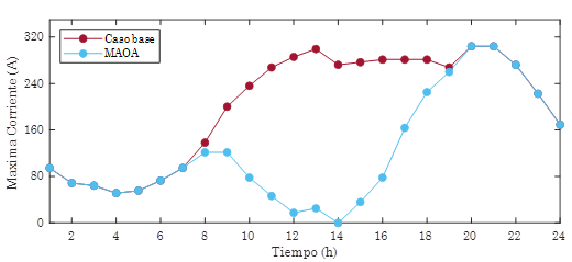 La Figura 7 presenta el comportamiento de la corriente máxima en este sistema de prueba. En el caso de referencia, la corriente máxima se produce en la línea que conecta los nodos 1 y 2. Esta corriente mantiene el mismo comportamiento de la generación de energía en el nodo de la subestación, ya que corresponde a la división entre la potencia inyectada y la tensión en el nodo de la subestación; El valor máximo de corriente se encuentra en las horas 20 y 21 con una magnitud de 304.128 A.