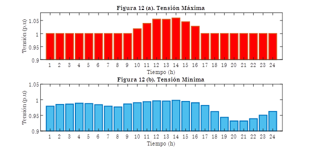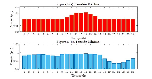 Figura 8 Comportamiento de la tensión durante el día para el sistema IEEE de 33 nodos en su versión de CC: Figura 8 (a). Magnitud de tensión máxima y Figura 8 (b). Magnitud de tensión mínima