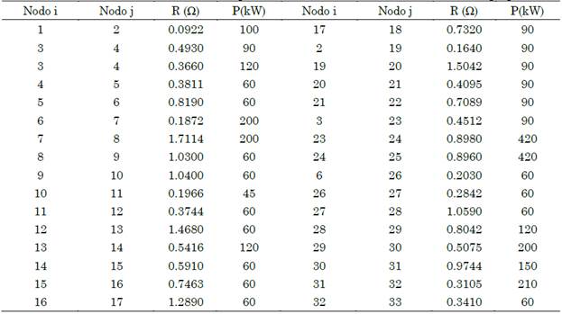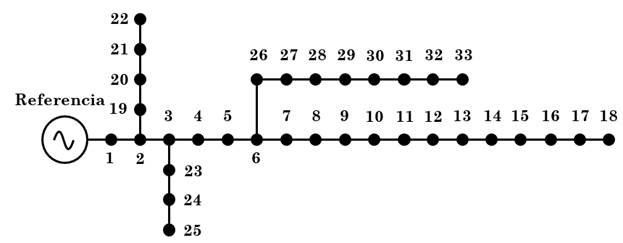 Este sistema de prueba en particular consta de un único punto de alimentación ubicado en el primer nodo de la red, el cual trabaja con una tensión de 12.66 kV y posee 33 nodos y 32 líneas de distribución. Siendo la demanda máxima en potencia activa de 3.715 kW, considerando el escenario donde se alcanza la hora pico. La Figura 2, presenta la topología de la red de distribución radial en cuestión y la Tabla 1, sus parámetros correspondientes, estos datos son tomados de [39].