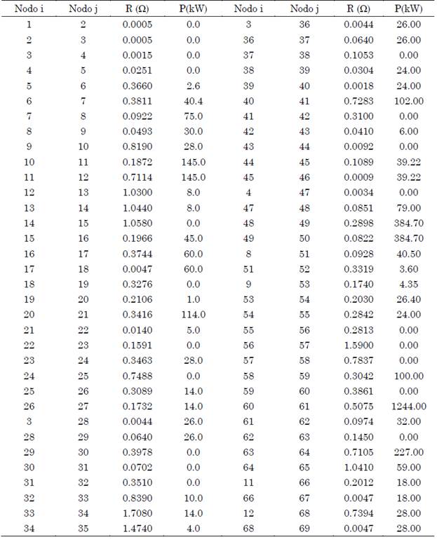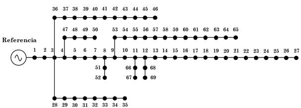 El segundo sistema de prueba se compone de 69 nodos, 68 líneas de distribución y que, de igual forma que el sistema de prueba de 33 nodos tiene un único punto de alimentación con nivel de tensión de 12.66 kV. Además, posee una demanda de potencia activa de 3890.7 kW. La topología del sistema de distribución se presenta en la Figura 3, mientras que la información referente a sus parámetros eléctricos se ilustra en la Tabla 2 estos datos son tomados de [39].