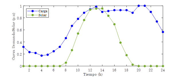 La curva de carga diaria y la curva de generación fotovoltaica normalizadas que se muestran en la Figura 4, son consideradas para evaluar el impacto de incorporar unidades de generación de energía fotovoltaica a los sistemas de pruebas anteriormente presentados. Los datos sobre la variación porcentual del consumo y la generación pueden encontrarse en [40]. Observando la curva de generación PV se aprecia que, el aprovechamiento del recurso solar se produce entre las horas 7 y 19.