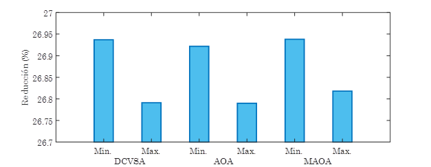 Los resultados numéricos de la Tabla 4 demuestran lo siguiente: i) El MAOA propuesto financia un valor de la función objetivo de 2662394.037 US$/año, logrando una mejora de 31.28 US$/año con respecto a la solución del DCVSA reportado en [24] y de 596.45 US$/año con respecto al AOA, lo que demuestra que las mejoras de exploración y explotación basadas en hiperelipses variables alrededor de la solución actual, permiten un mejor desempeño numérico; ii) Al ubicar las tres unidades de generación PV dadas por el MAOA en los nodos 11, 15 y 31, los cuales tienen una capacidad total de potencia instalada de 3588.97 kWp, permiten una reducción del 26.938% con respecto al caso de referencia, es decir, 981648.97 US$/año; iii) Empleando las soluciones entregadas por los otros algoritmos, el DCVSA logra una reducción de 981617.69 US$/año, es decir 26.937% y el AOA logra una reducción de 981052.52 US$/año, es decir 26.922% con respecto al caso de referencia, lo que demuestra que estas metodologías empleadas pueden generar ahorros anuales superiores al 26.92%. En la Figura 5, se presenta la comparación entre estos porcentajes de reducción teniendo en cuenta la mejor y peor solución de cada algoritmo; iv) Respecto a los la ubicación de los generadores PV en el sistema, el DCVSA los ubica en los nodos 9, 15 y 31, con una potencia total de 3587.27 kWp y el AOA los ubica en los nodos 14, 13 y 32, con una potencia total de 3604.72 kWp, esto muestra que se tienen soluciones similares tanto en ubicación de los generadores PV como en la potencia total que inyectan al sistema, lo que implica que el problema estudiado tiene soluciones casi óptimas con pequeñas variaciones en el valor de la función objetivo final. Esta situación dificulta la búsqueda de un óptimo global, por lo que deberían realizarse estudios adicionales en este ámbito de investigación.