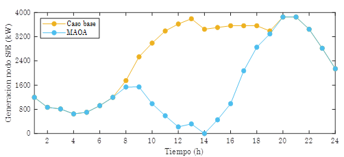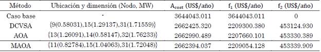 Para demostrar la efectividad del MAOA propuesto para resolver el problema de la ubicación y el dimensionamiento óptimos de las fuentes de generación PV en redes eléctricas de distribución de CC, se presenta la aplicación de este método de optimización en el sistema de prueba IEEE de 33 nodos [39]. La Tabla 4, presenta la comparación entre el caso de referencia sin la conexión de los generadores PV al sistema y la solución obtenida por el DCVSA, AOA y MAOA.