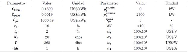 La Tabla 3, contiene todos los parámetros utilizados para evaluar la función objetivo definida en (1). Estos datos fueron recolectados a partir de la información obtenida de [41], [42].