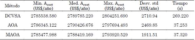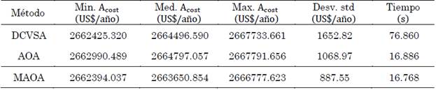 Los resultados de la Tabla 5 revelan esto respecto al MAOA propuesto: (i) Es el algoritmo con la más baja desviación estándar tras 100 ejecuciones consecutivas, lo que significa que todas las soluciones obtenidas por este algoritmo están contenidas en un espacio muy cercano al valor medio; (ii) La diferencia entre el mejor y el peor valor obtenido en el MAOA es de aproximadamente 4383.58 US$/año de operación, lo que supone menos del 0.16% del costo anual de operación en el caso de referencia; (iii) En cuanto a los tiempos de procesamiento, el DCVSA es el que más emplea tiempo, el MAOA y el AOA presentan tiempos similares, sin embargo, el MAOA es el más rápido de los tres.