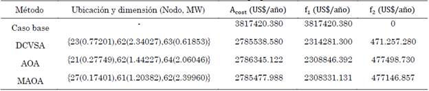 Los resultados numéricos de la Tabla 6 demuestran lo siguiente: i) El MAOA propuesto financia un valor de la función objetivo de 2785477.988 US$/año, logrando una mejora de 60.59 US$/año con respecto a la solución del DCVSA reportado en [24] y de 867.13 US$/año con respecto al AOA, lo que demuestra que el MAOA tiene un mejor desempeño numérico; ii) Al ubicar las tres unidades de generación PV dadas por el MAOA en los nodos 27, 61 y 62, los cuales tienen una capacidad total de potencia instalada de 3777.439 kWp, permiten una reducción del 27.032% con respecto al caso de referencia, es decir, 1031942.39 US$/año; iii) Empleando las soluciones entregadas por los otros algoritmos, el DCVSA logra una reducción de 1031881.8 US$/año, es decir 27.030% y el AOA logra una reducción de 1031075.258 US$/ año, es decir 27.009% con respecto al caso de referencia, lo que demuestra que estas metodologías empleadas pueden generar ahorros anuales superiores al 27.00%.