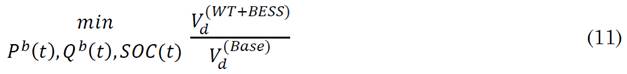The objective is then formulated in (3) by complementing the severity index with a maximum voltage recovery sensitivity parameter (Voltage Sensitivity Index VSI), which depends on BESS injected injected var q es,i (N es refers to the number of BESS units).