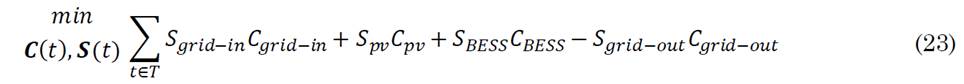In [86], the objective is to minimize the cost of operating a PV-BESS system by accounting the costs of importing energy from the grid, the cost of PV generation, the cost of BESS cycle depreciation and the costs of selling (exporting) energy to the grid as shown in (23).