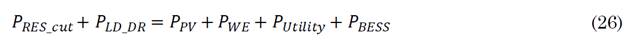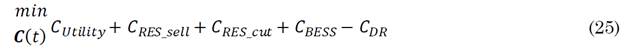 The cost function for BESS includes a model for Battery cycling aging based on cycle state of charge (SOC=1-DOD) and charge/discharge dynamics relative to rated values. This problem is constrained to power balance and BESS power and SOC limits. The status of Grid-in and Grid-out can’t be operative (a logical one) at the same time. In [87], a similar structure for costs is presented and a model for Demand Response scheme is formulated, where it is desired to minimize operational costs, as in (25), for a WE-PV-BESS in a distribution network. Costs are defined for the power flow balance between utility and distribution companies, RES curtailment and sell energies, BESS energy during charge and discharge, and Demand response Scheme (DR).
