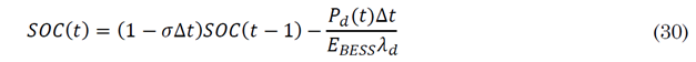 The E BESS (k) stands for the rated capacity of the k th BESS unit. BESS model includes self-discharge rate σ, efficiencies λ, and SOC.