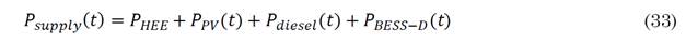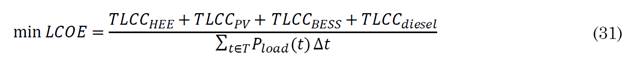In [89], the operation of a Hybrid Renewable Energy microgrid (HREM) is optimized to minimize three objective functions in a muti-objective framework, The levelized Cost of Energy (LCOE), The Loss of Power Supply Probability (LPSP), and Greenhouse Gas Emissions (GHGE) shown in (31) ( (35) respectively. This microgrid counts with PV, HEE, and conventional Diesel generation. Demand is divided in agricultural and residential.