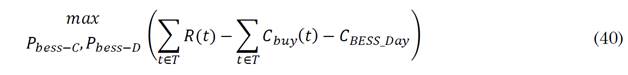 In [91], BESS operation is optimally scheduled by maximizing revenues from energy generation and minimizing energy purchasing costs and battery degradation as it is shown in (40).
