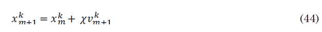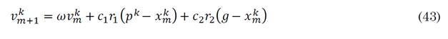 Where v k m+1 is the velocity of the particle (initialized random) at the next step, v k m is the velocity at the current step, ω is the inertial coefficient of the particle (weights particle tendency to continue his own direction), c 1 is the cognitive acceleration constant (weights particle’s tendency to follow the direction of the best place it has ever found), c 2 is the social acceleration constant (weights particle’s tendency to follow the direction of the best place the swarm has ever found), r 1 and r 2 are random real numbers between zero and one. x k m , p k and g are the actual position of the particle k, the best position found by the particle k and the best position found by the swarm respectively, g and p k positions are related to the value of the decision variables when the objective function reached best global and best particle values respectively. The position of each particle is updated after updating each particle’s velocity as in (44).