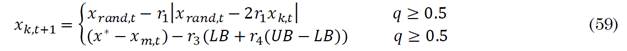 Where E 0 initial energy based on the random parameter r 6 , ranging from minus one to one in each iteration t. Exploration and exploitation are performed differently depending on random parameters (from zero to one). During exploration, the random parameter q defines the exploration strategy to be carried out. If q is greater or equal to 0.5, then a strategy of perching based on random locations is performed. The exploration is based on the position of other hawks otherwise following the averaged position of all agents. The update of the position of the agents during exploration is executed following (59). The average position of the hawks is described by (60).