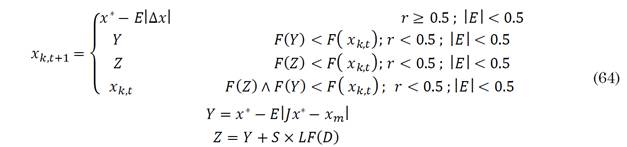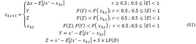 Where r 1 , r 2 , r 3 and q are random numbers from zero to one. x m,t is the average position of the population and UB,LB are the maximum and minimum locations of the population, respectively. During exploitation, the energy of the prey and a random parameter r control the way the hawk attacks the prey. If r ≥ 0.5 and 0.5 ≤|E|<1, then the hawk performs a soft besiege, updating its position in direction to the difference of positions between the agent and the prey ∆x modulated by ∆x and the strength of the prey to jump and scape the attack J. If r < 0.5 and |E|≥0.5 the hawk can update its position either by soft attacking the prey (update its position based on the location of the prey, the strength J and the position of the hawk) or by attacking the prey following the Levy Flight function imitating leapfrog movements on the prey (soft besiege with progressive rapid dives). Firstly, the decision is made by evaluating the objective function of the updated solution when soft-attacking (F(x k,t+1 )) and comparing it with the objective function value of the original solution (F(x k,t )). If F(x k,t+1 ) < F(x k,t ) then the updated solution is assigned for the next iteration. If the previous condition is not met, then the objective function value for the updated solution based on the Levy Flight function is now compared against the objective value of the original solution and if the condition F(x k,t+1 ) < F(x k,t ) is met, then the updated solution is assigned for the next iteration. If neither condition is met, then the original solution is preserved. These behaviors are described in (61). The jump strength and the position difference are calculated as in (62) and (63) respectively.