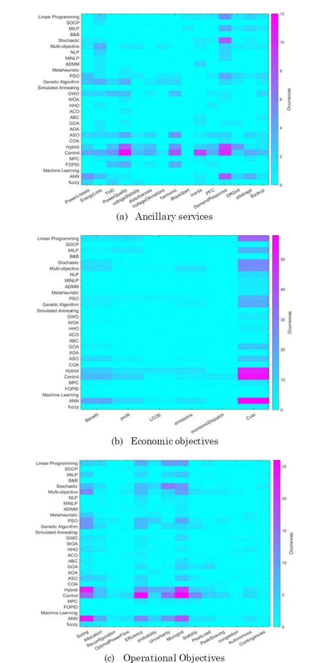 Having in mind the overview in ancillary services shown in Table 1, the review on optimization problems, the techniques shown in Table 2 and the total results of the search, Optimization problems are related to implemented techniques following the number of occurrences in the search and are shown in the color maps displayed in Figure 2.