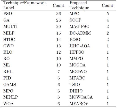 The list of results is reduced to 200, and a list of optimization techniques and frameworks is obtained from abstracts. This information is filtered and presented ordered by the appearance count in the right side of Table 2., while in the left side, optimization methods (or frameworks If optimization is performed indirectly) are tagged with the base technique if modifications or hybridizations are proposed.