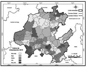 De la misma manera, el índice de urbanización, representado en el mapa de la figura 3 de forma descriptiva por la presencia de población, construye una razón de concentración de población urbana. El único municipio que presenta un índice muy alto de urbanización es Pachuca de Soto, mientras que los municipios con índice alto de urbanización son Huejutla, al norte del estado; Ixmiquilpan, en la zona centro; Tepeji del Río y Tula de Allende, en la parte suroeste; Tizayuca, en el sur; Mineral de la Reforma, en el centro-sur; y Tulancingo, al sureste. Si se realiza una comparación con los municipios metropolitanos presentados en el mapa de la figura 2, no hay relación entre el grado de urbanización y la condición metropolitana, por lo que se presenta la necesidad de tener en cuenta un mayor número de variables y diversidad de escalas.